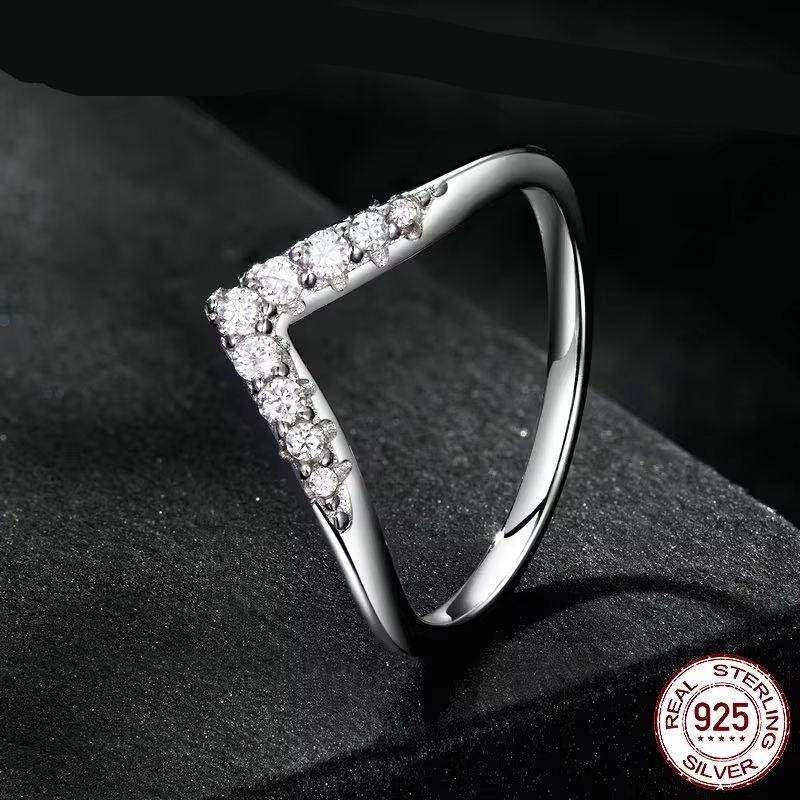 Un anillo delicado y radiante con moissanita en forma de V, elaborado en Plata de Ley 925. Su diseño elegante y minimalista lo convierte en la elección perfecta para compromiso, boda o regalos especiales.