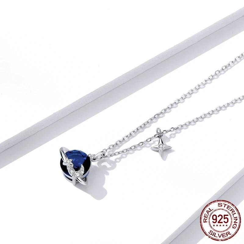 Este collar de Plata de Ley 925 presenta un fascinante colgante de planeta azul rodeado de delicadas estrellas. Un diseño único y llamativo que evoca el misterio del cosmos y el poder del amor infinito. Ideal como regalo de compromiso simbólico, aniversario o simplemente para quienes aman la magia del universo.