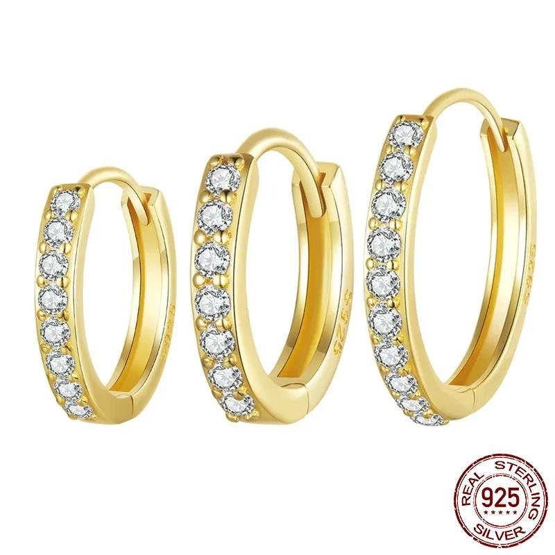 Brillo eterno en un diseño clásico. Estos pendientes de aro están elaborados en Plata de Ley 925 auténtica, con un delicado chapado en oro y piedras de Moissanita de laboratorio que imitan el resplandor del diamante. Elegancia atemporal para cada ocasión.