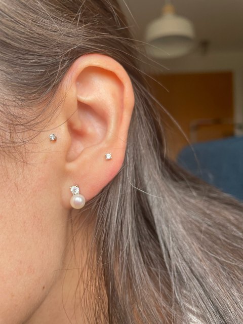 Muy bonitos!! Mi oreja es pequeña y me encanta como quedan, comparado con mi auténtico diamante y estos pendientes son más claros.