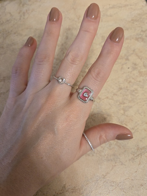 Anillo de relieve delgado, se ajusta fiel al tamaño. El cristal es rosa claro, parece suave.