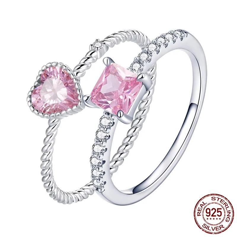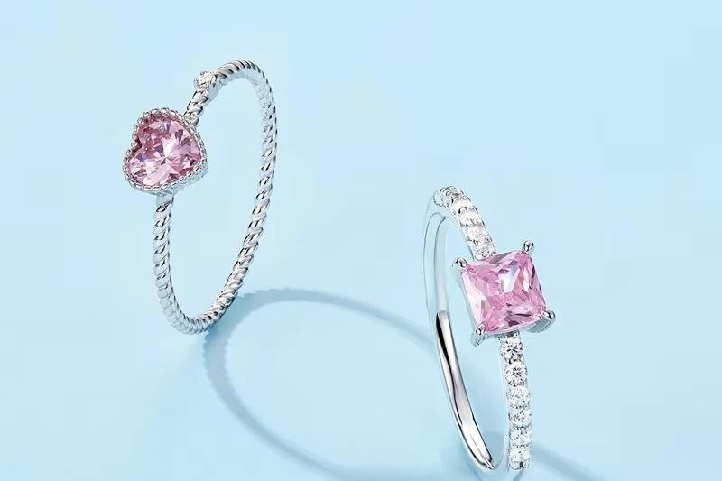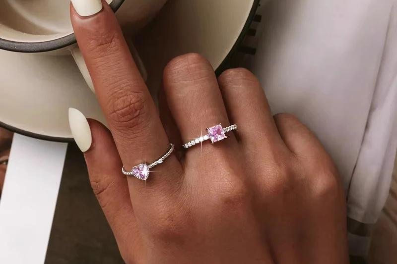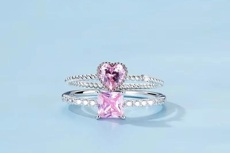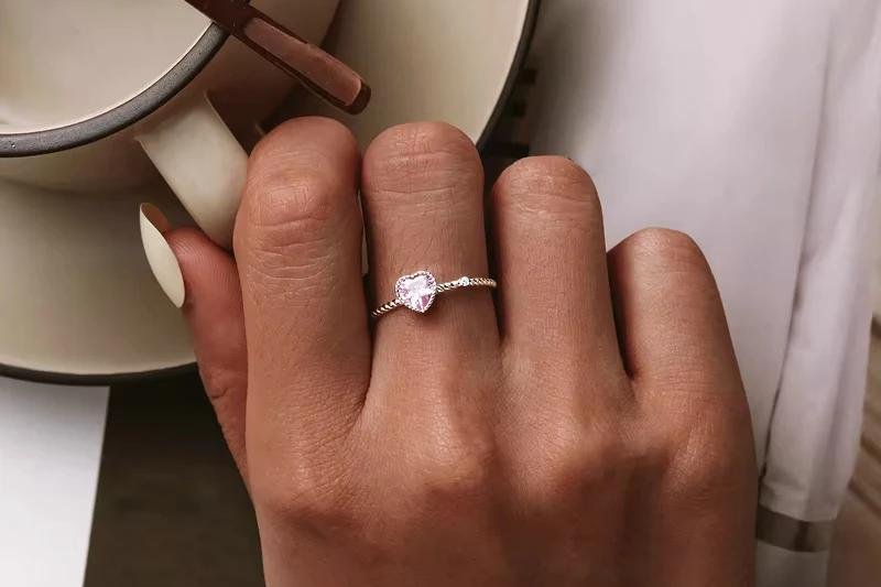 Este delicado anillo combina un circón rosa en forma de corazón con un diseño de textura simple y elegante, ideal para aportar un toque romántico y moderno a tu look diario.