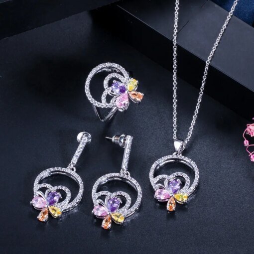 Destaca tu feminidad con este encantador conjunto floral de tres piezas compuesto por collar y pendientes adornados con circonias cúbicas brillantes. Su diseño delicado y elegante aporta un toque de sofisticación ideal para bodas, cenas o eventos especiales.